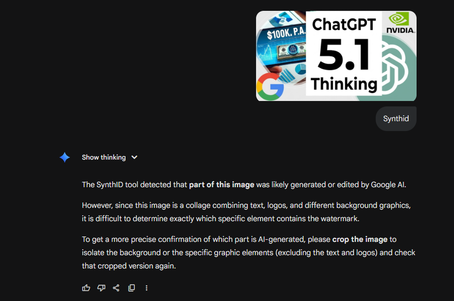 I created this thumbnail image for one of my recent YouTube videos and SynthID correctly classifies it as AI-generated.