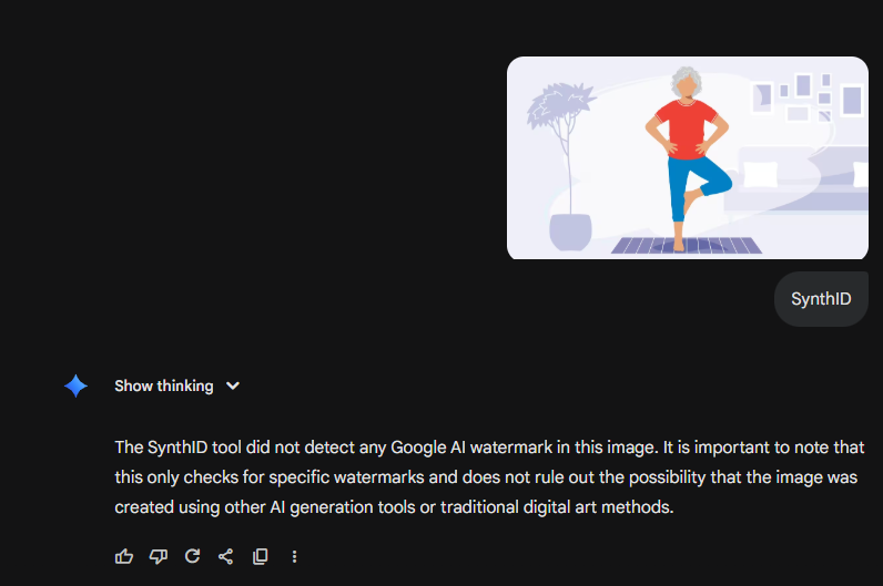 The simple solution for Google Gemini (and some other vendors) is to copy and paste the image into Gemini and run “SynthID” with it. This is a complex watermark technique that works for most images. However, it doesn’t work in very important application areas as shown in Example 3.