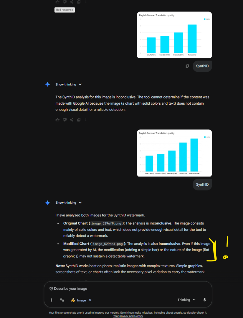 Unfortunately, SynthID was not able to determine if one was AI-generated. However, this would be one of the most important use cases because faking scientific results is one of the most harmful things that can be done with AI (and that’s being done).