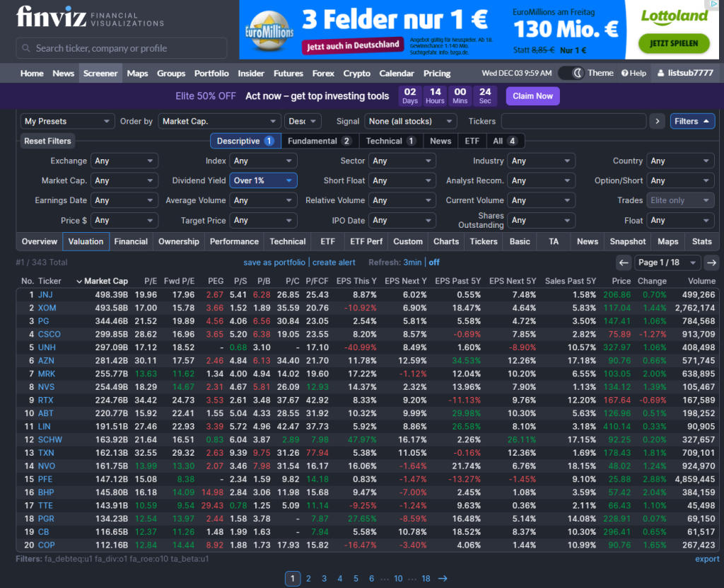 Filter 1 – Dividend yield ≥ 1%